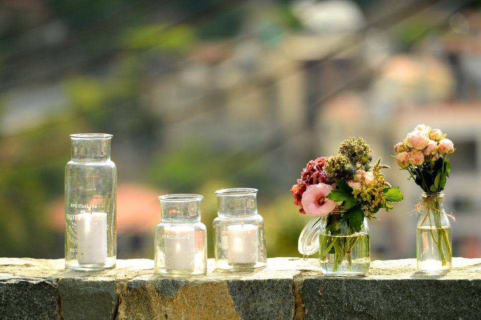 Słoiczki pełnią funkcję zarówno wazonów, jak i świeczników.